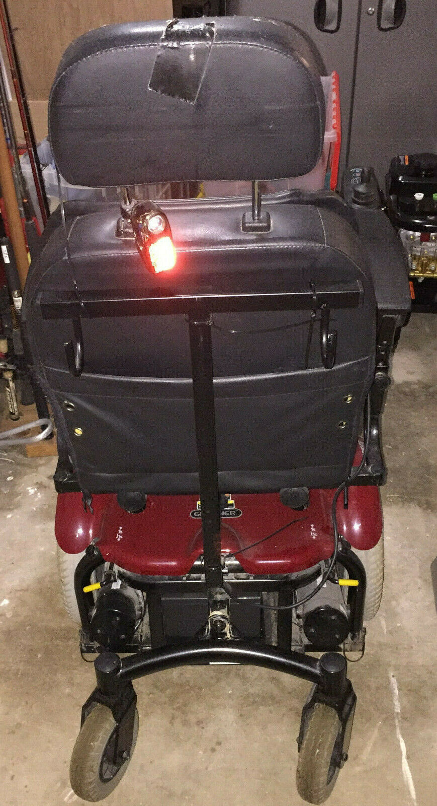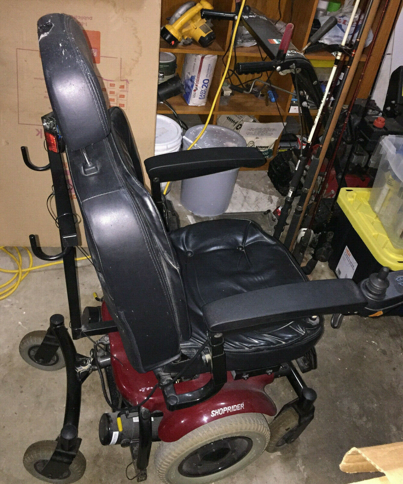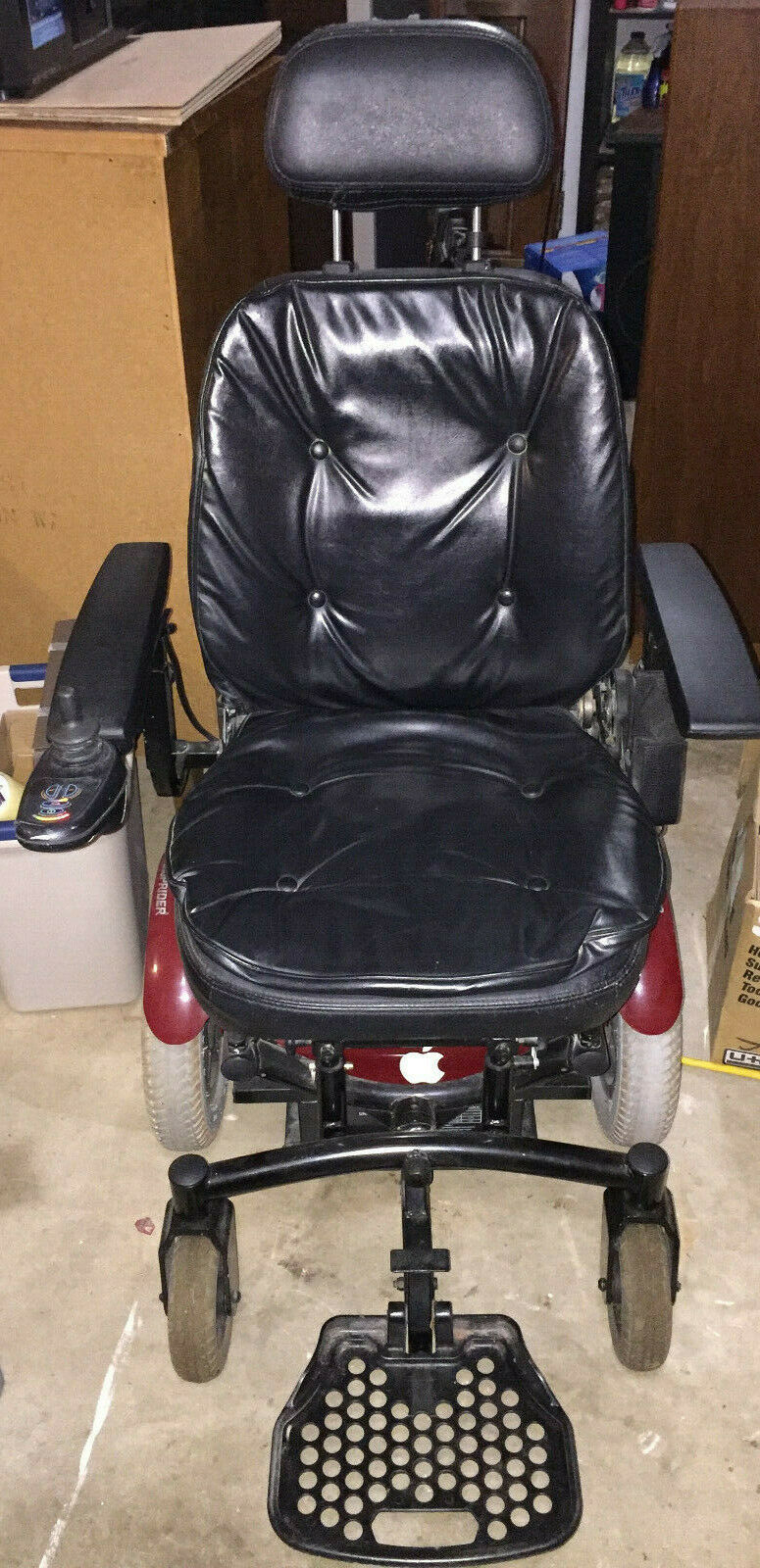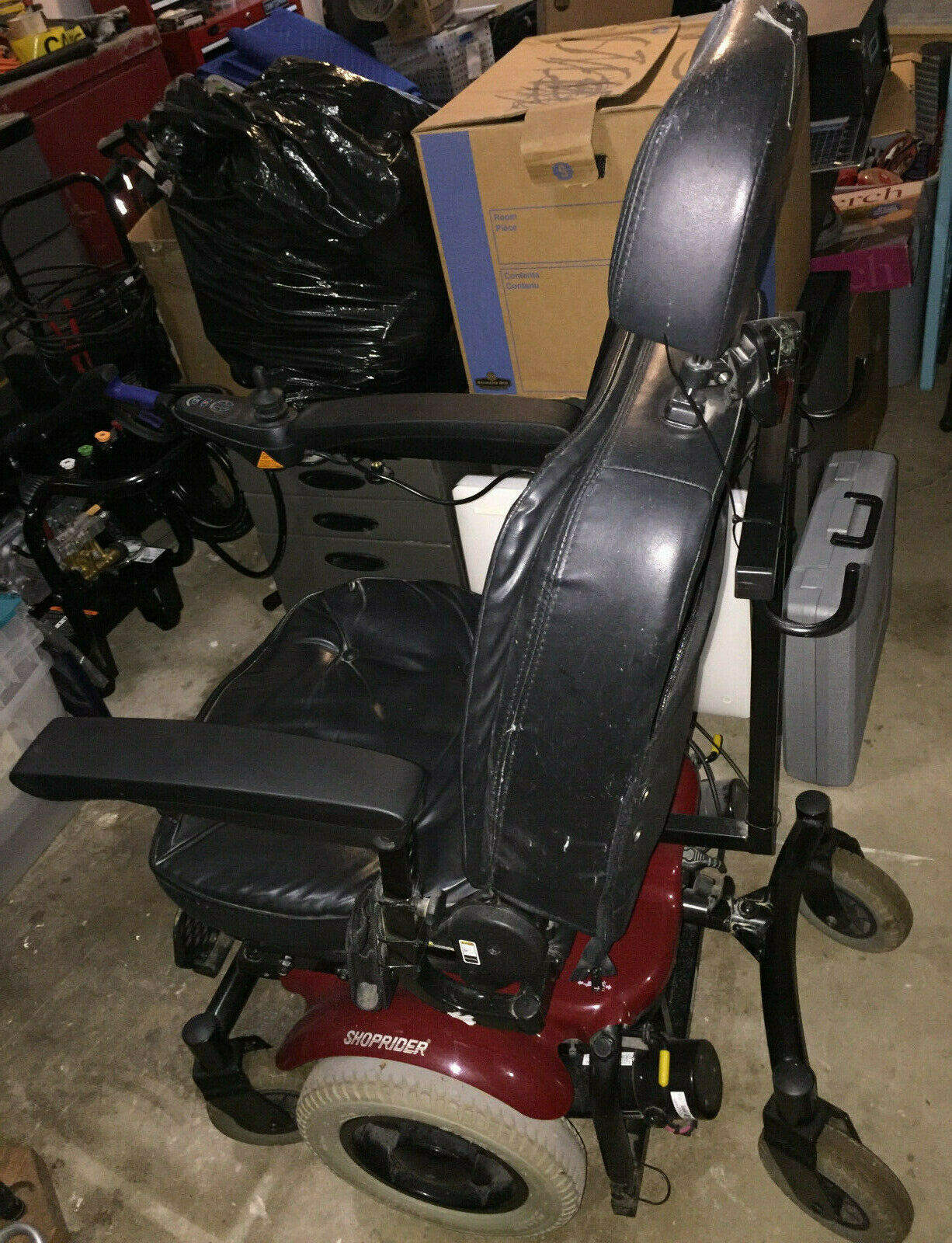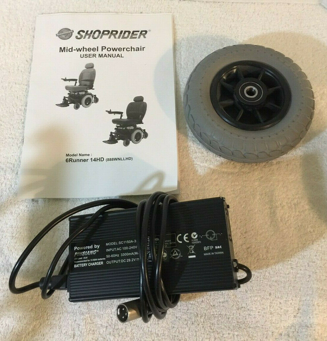 Shoprider 6Runner 14HD ( Heavy Duty ) electric wheelchair. In good condition with a good battery and also comes with two new extra batteries, manual, charging cord, adjustment tools and extra small tire. Maximum 450 pound weight capacity. Only damage at all is the headrest has snags as shown and a small tear with tape. No tears in seat. Arm rest were replaced new recently. Current battery holds a good charge. Has a battery operated safety light attached to back.
