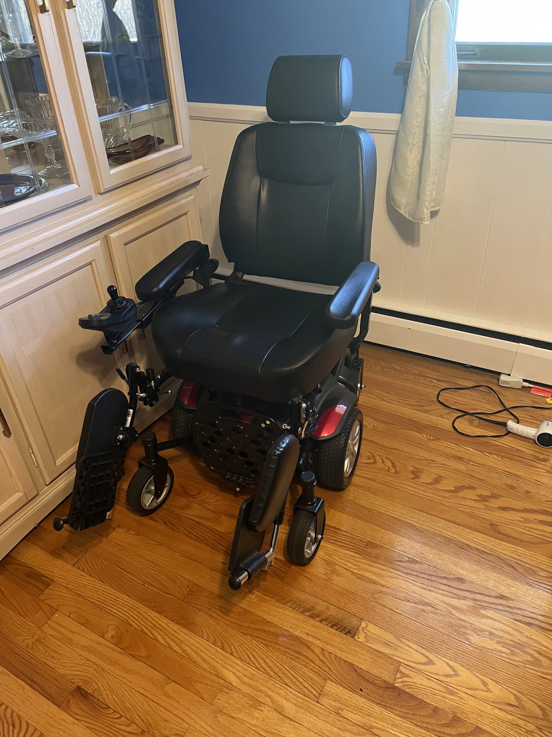 Only used once also has leg rests, Has a captain’s chair width is 20 inches, Height adjustable, swivel and reclines Armrests swing away adjustable angel, Measurements width 28,8 inches Length is 67 inches Weight capacity 300 pounds cruising range 15 miles turning radius 20 inches top speed 4mph climb angle 6 degrees Batteries are 12 volt x 35ah Brakes are electromagnetic has a cup holder anti-tip device easy battery access, semi-reclining seat back drive wheel :mid tool free adjustment adjustable footplate quick release controller power cord molded seat and armrests flat free wheels Titan AXS Powerchair comfortably takes you where you want to be both indoors and out, It comes in black with red panels, The Titan mid wheel drive power hair has easy front freewheel navigation with best in class 20 inch turning radius,will have to pick up cannot deliver will only accept cash price includes wheelchair carrier $2000 thanks