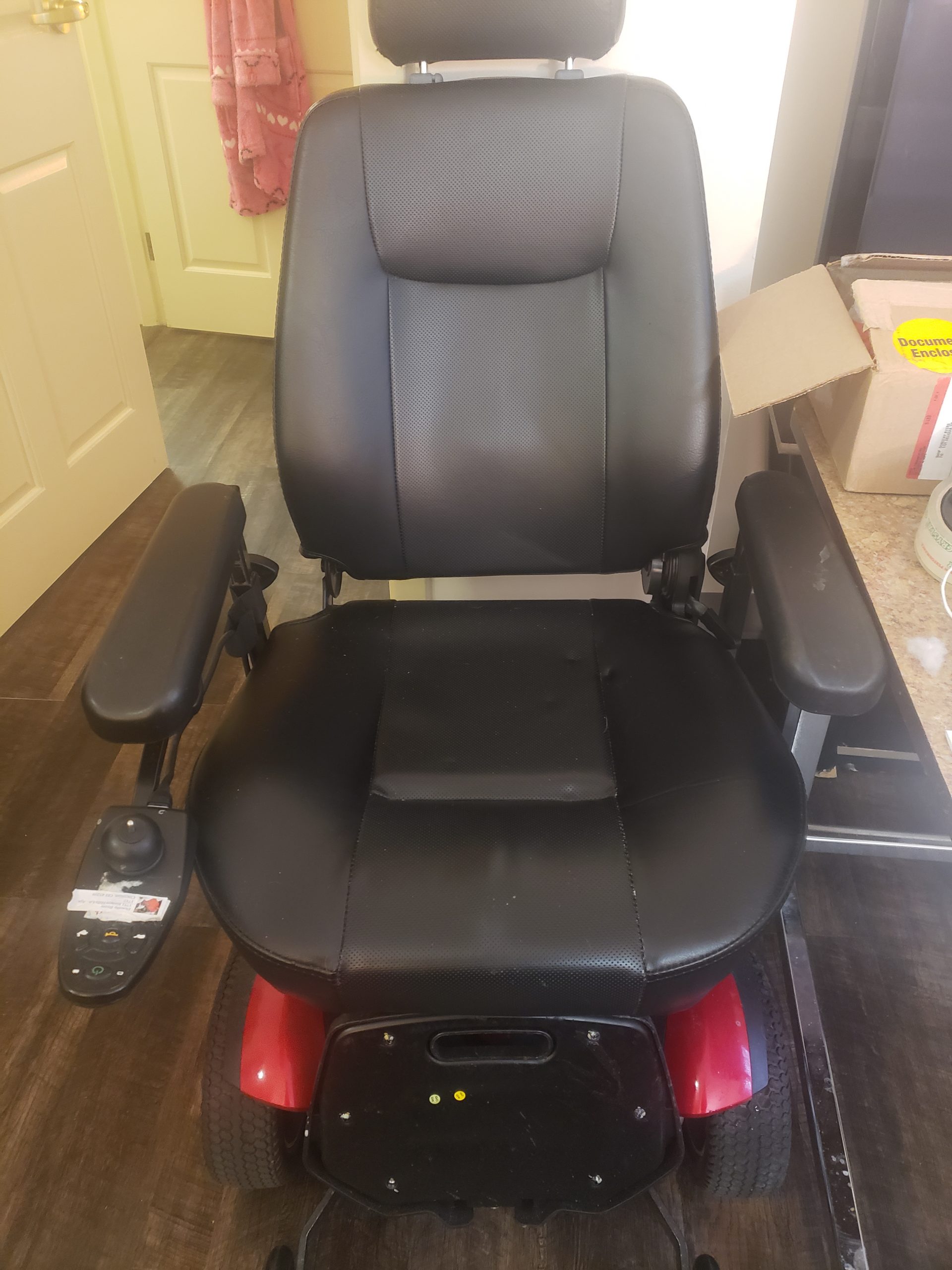 Gently used scooter. New tires and extra set of chair pads. Excellent condition. operates very well . Battery operated. 4 tires / 3 speeds. Red trim. Fully adjustable with padded armrests and foot rests . This was my moms chair she no longer needs. It was fully serviced and well cared for. Mostly indoor use . Includes owners manual. Comfort adjustments