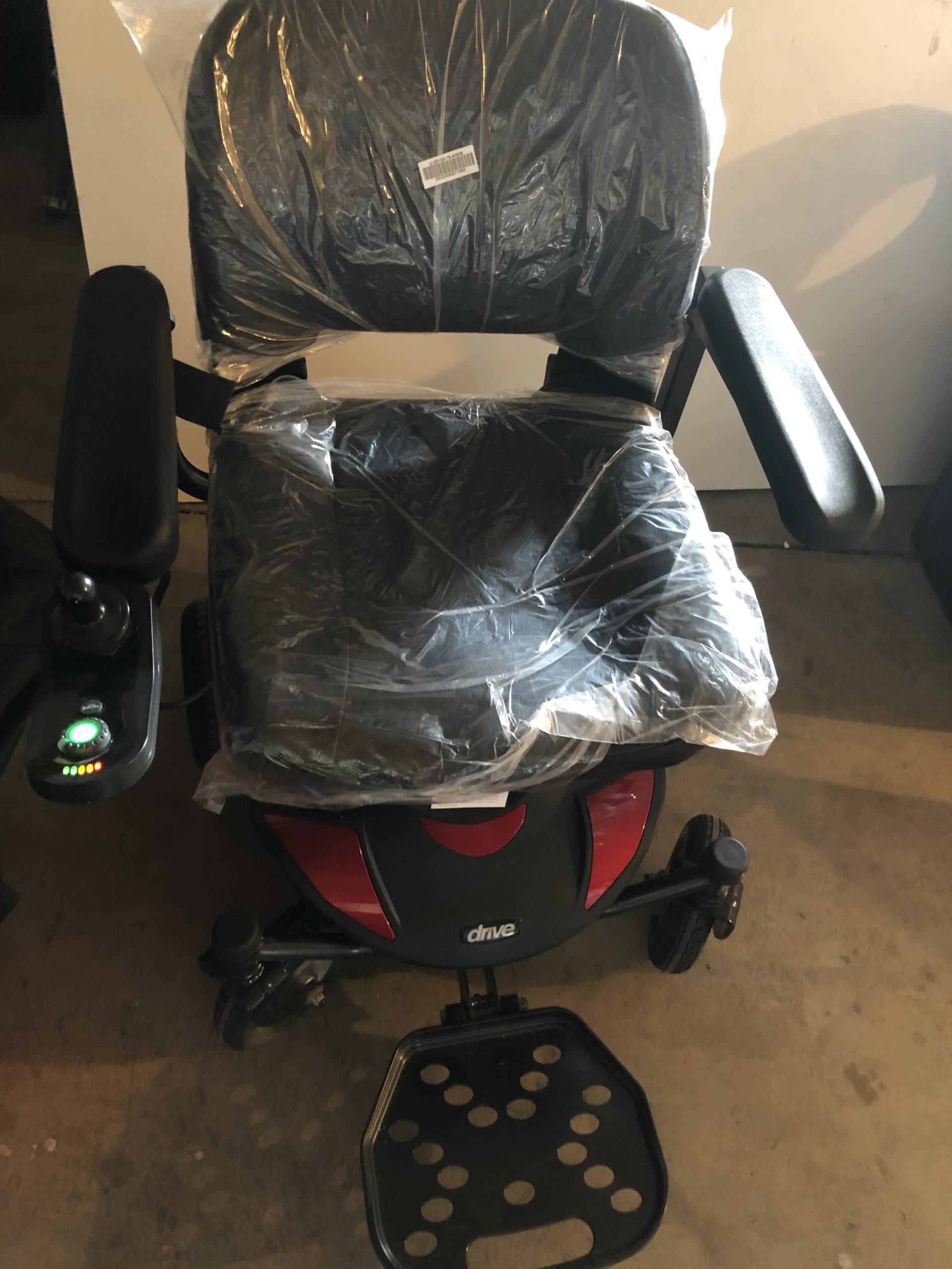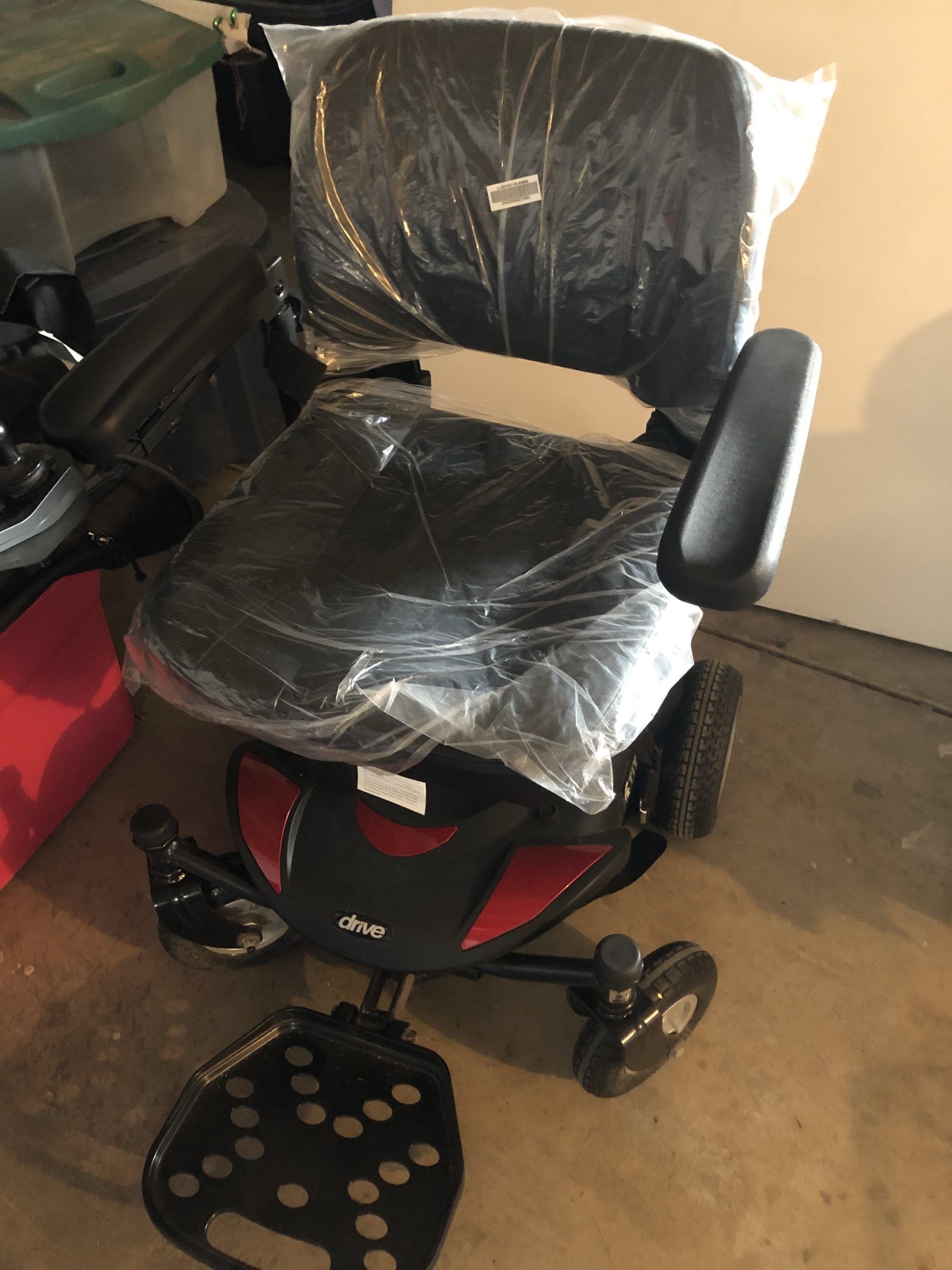 New Titan LTE portable electric wheelchair. Folding wheelchair carrier for transport on a car is included. Requires hitch. Carrier folds up against back of vehicle when not in use for easier driving and parking Protection cover with straps to secure wheelchair to ramp included.