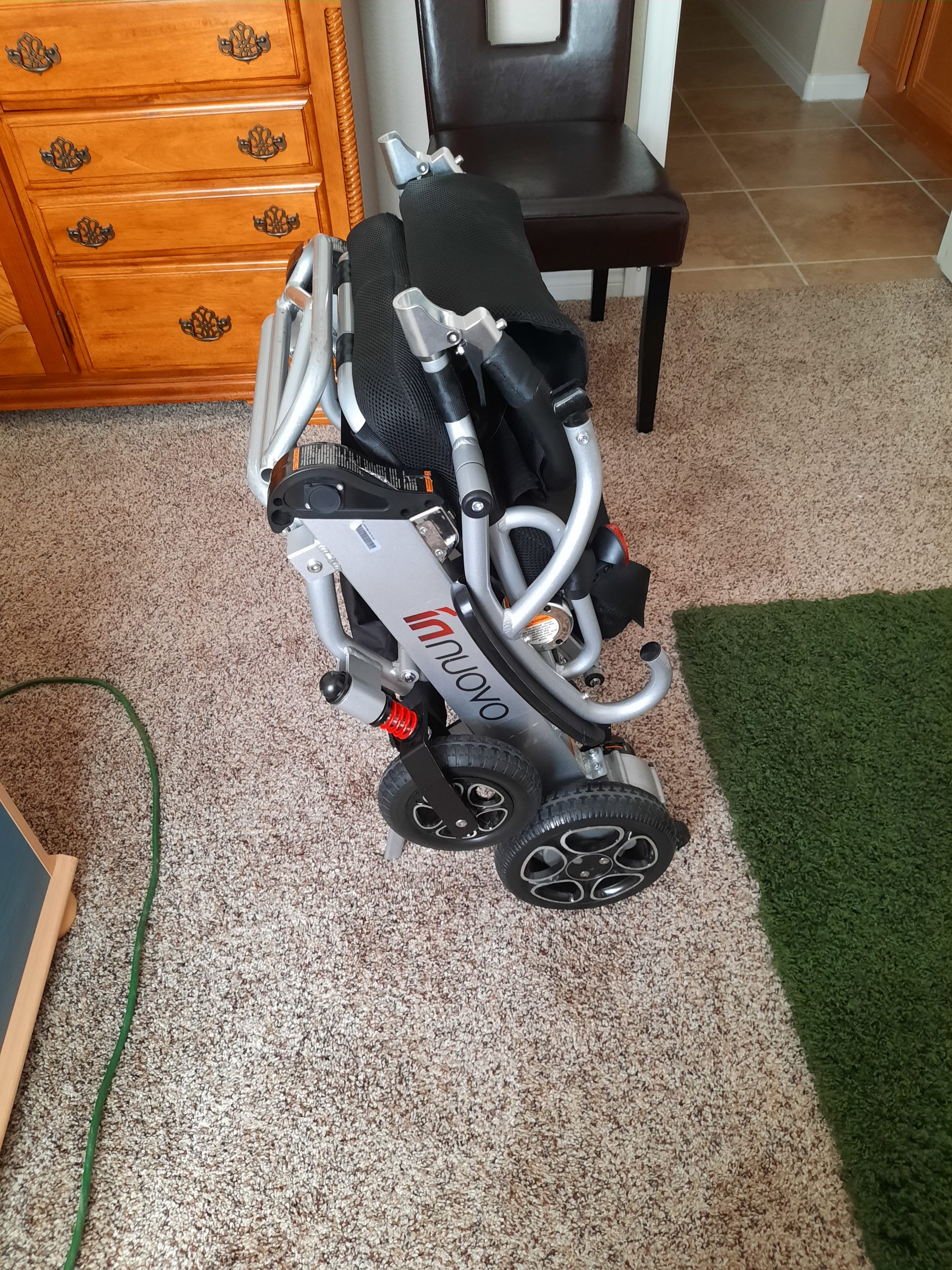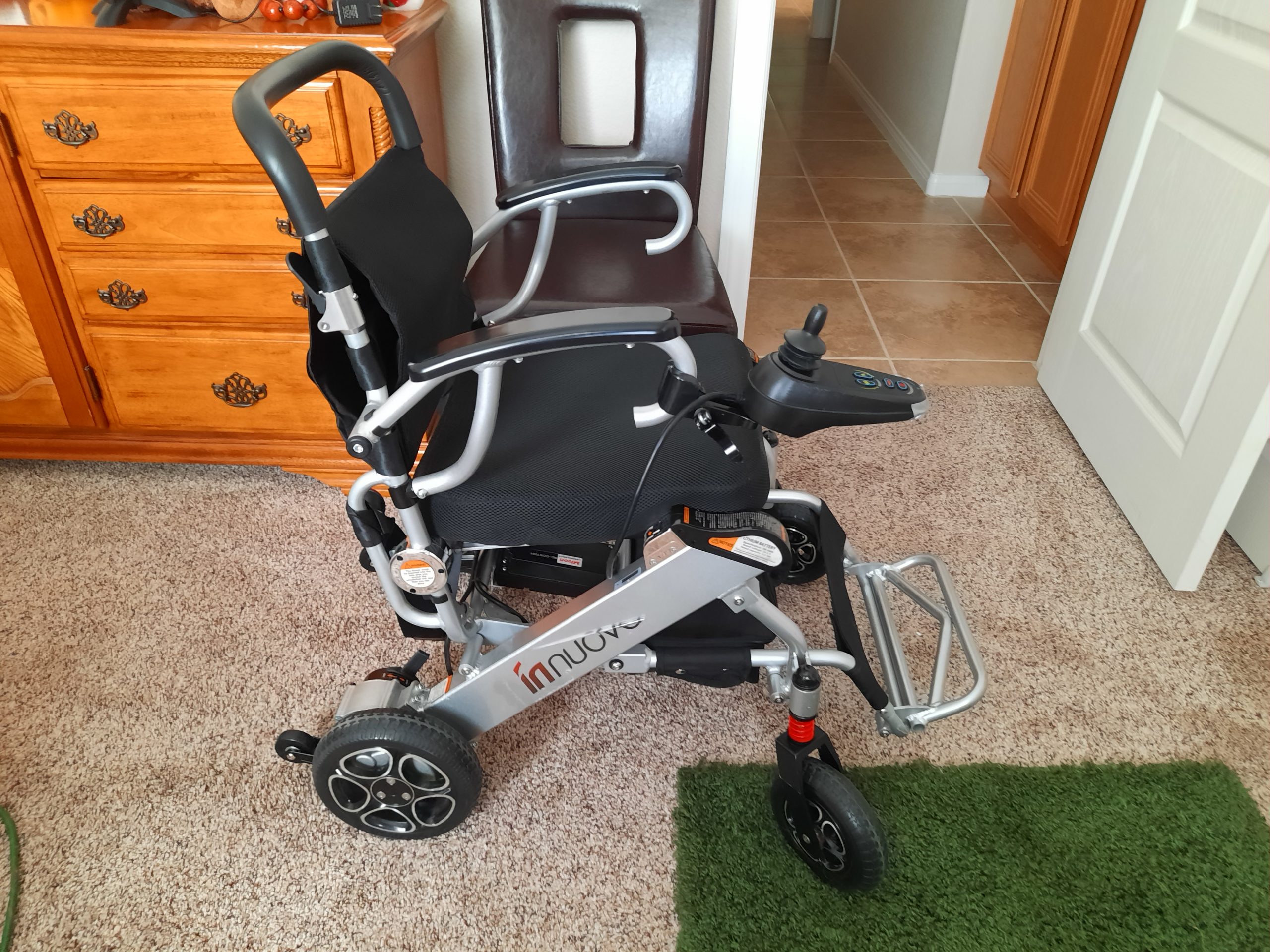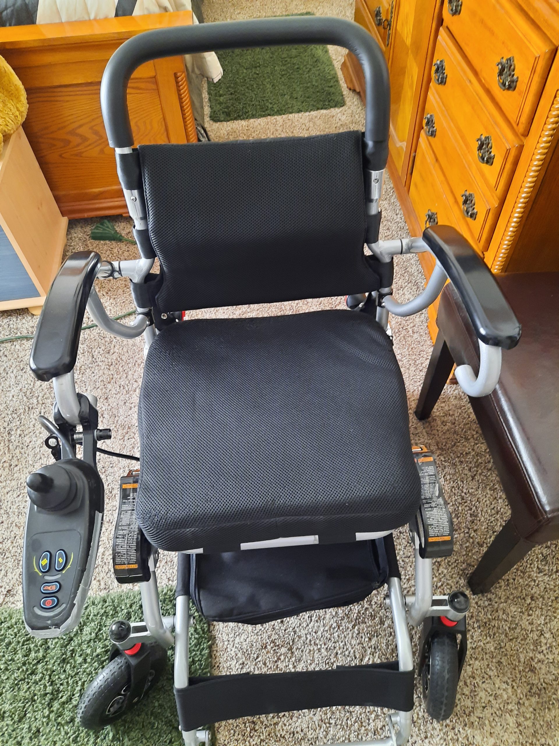 Bought in July 2019, from Amazon, New one is $2100, lightweight powered wheelchair, aircraft friendly, 12.5 miles on single charge of both batteries. Good condition, comfy, black padded seat, 3.7 mph max, folds down to roll like a carry on, arms fold back for easy access. Footrest folds away if not required. Joystick can be operated by assistant,free wheels if runs out of power so can be pushed by an assistant. In Las Vegas Nevada.