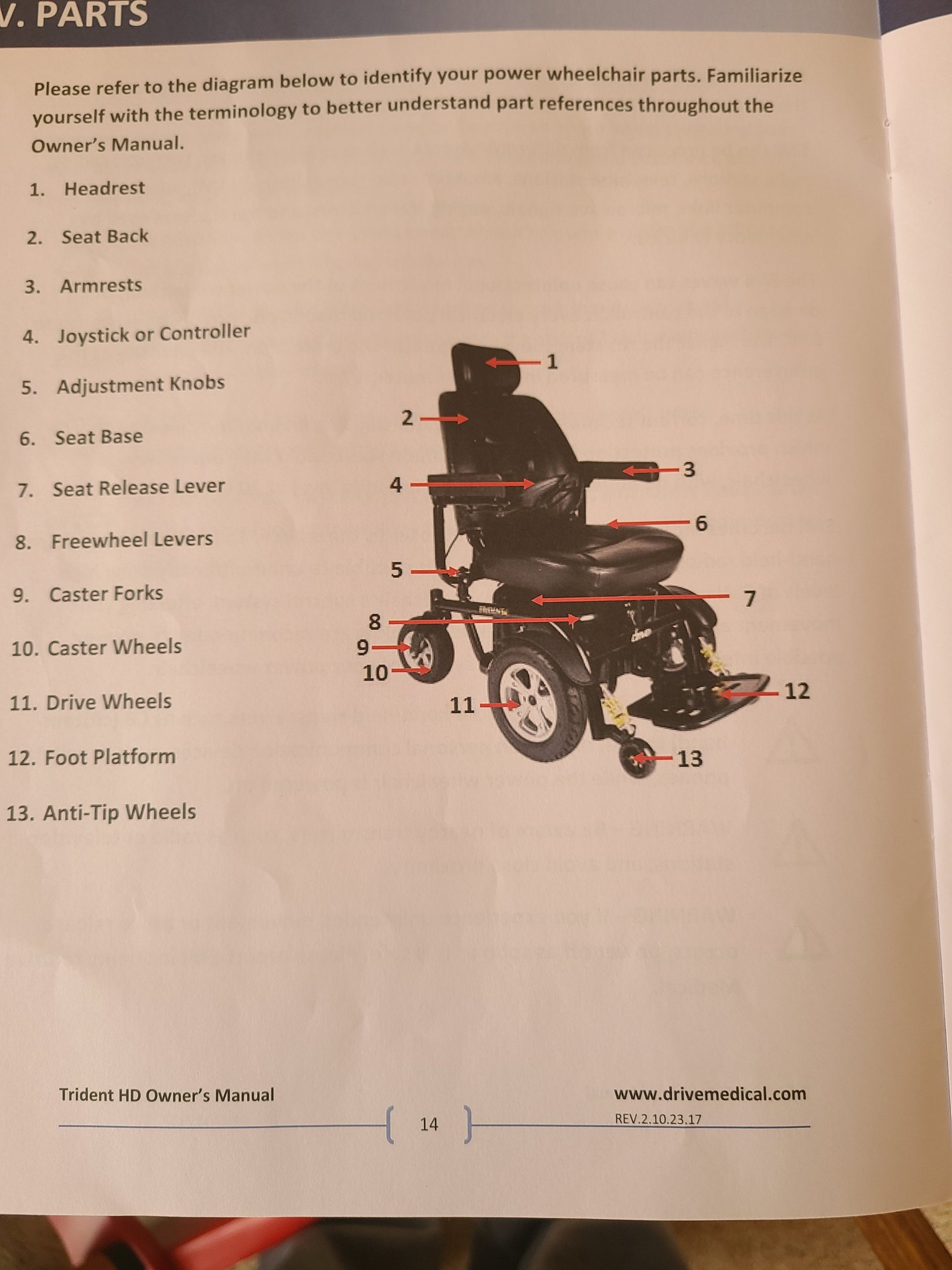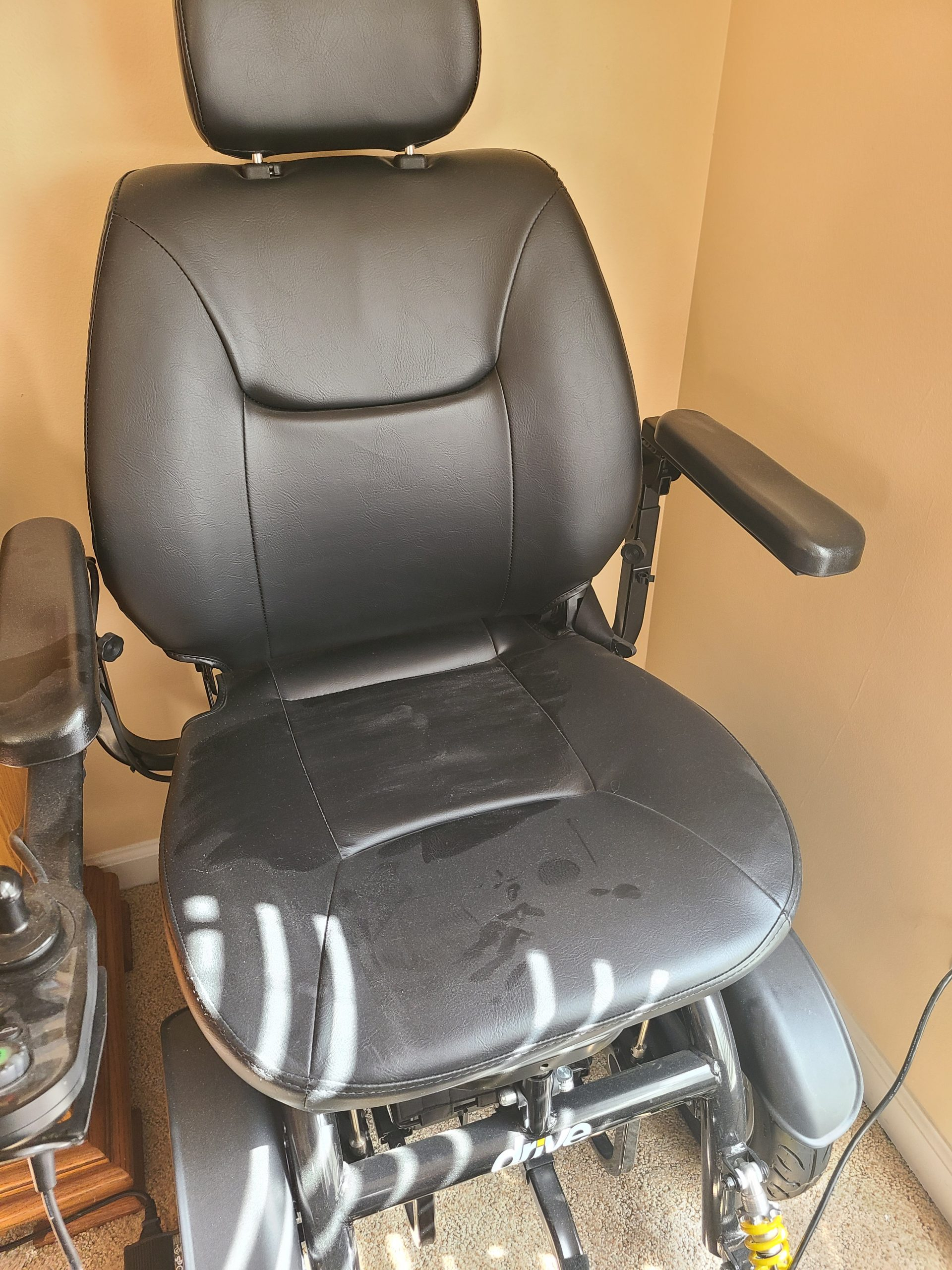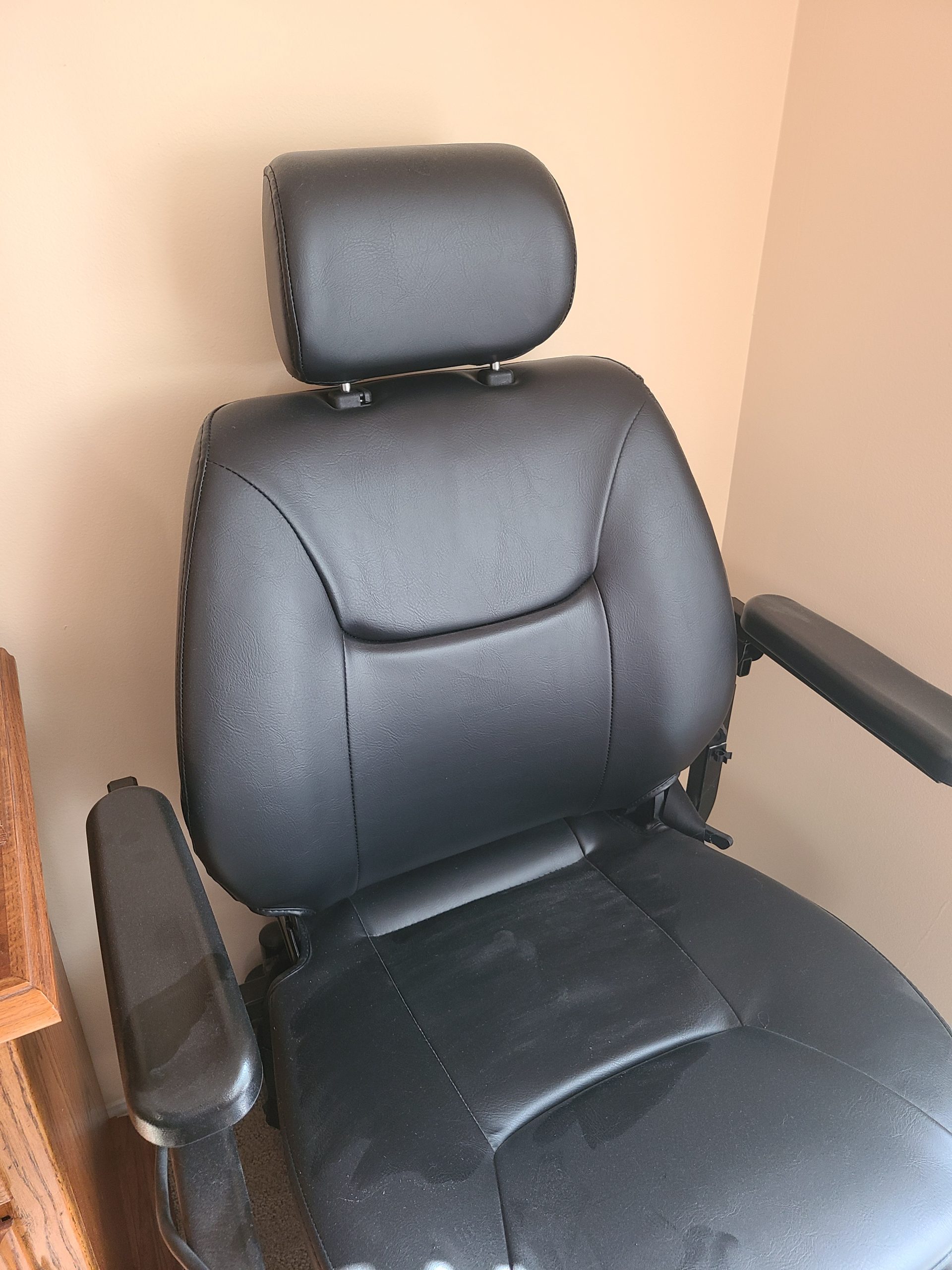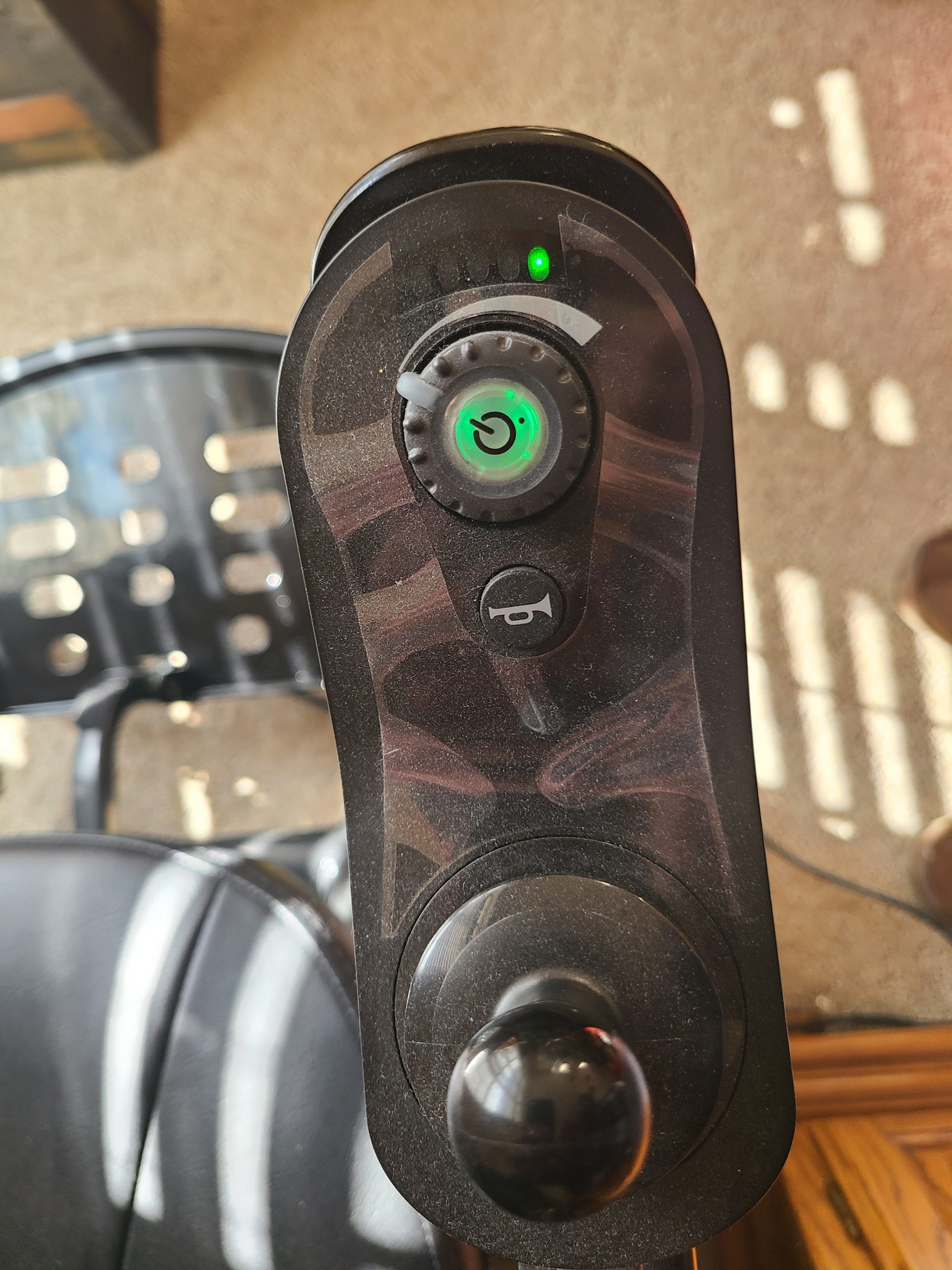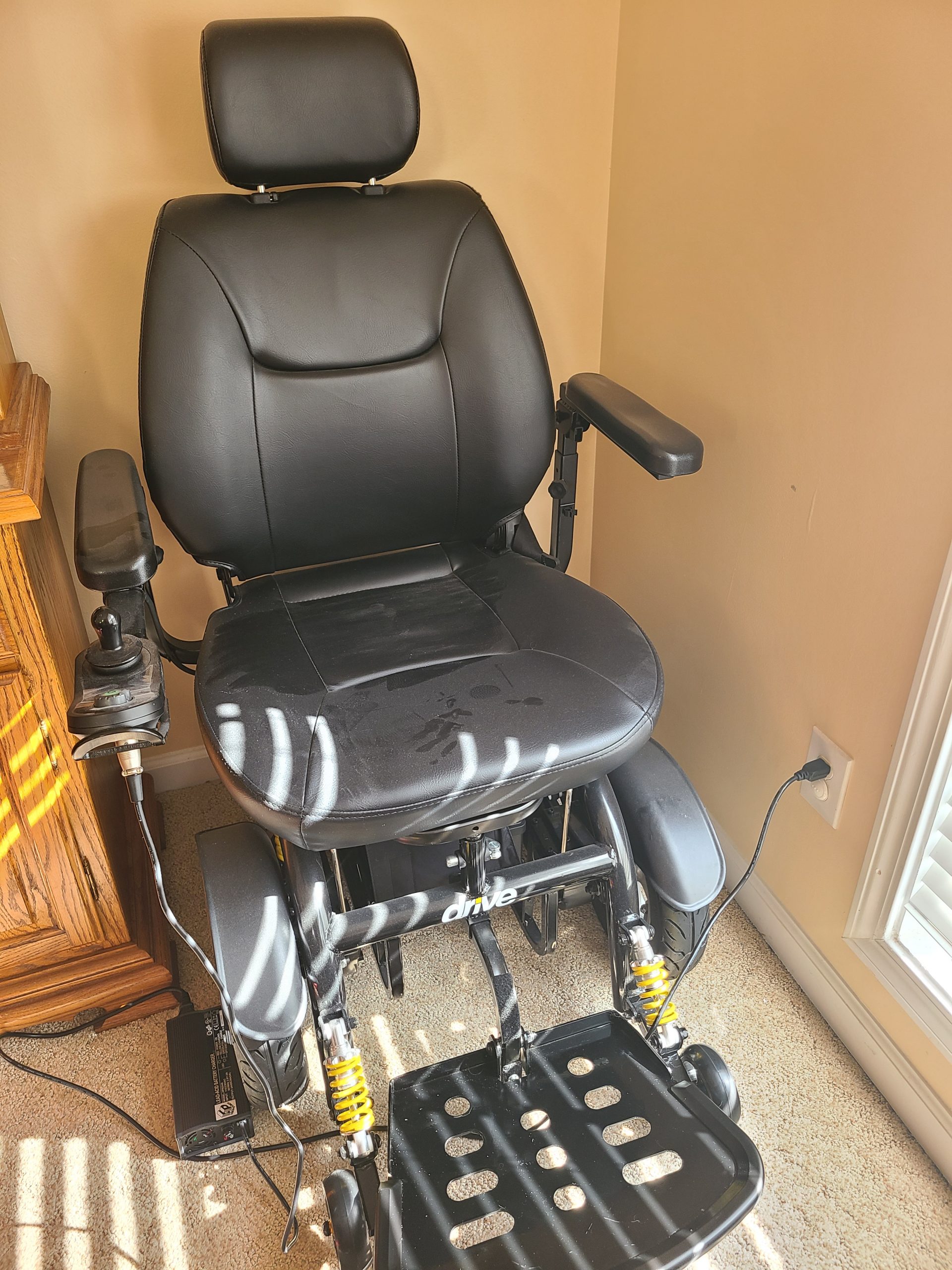 Flip up footpath. Front anti tip wheels. Armrests are padded, adjustable and removable. Easy access to internal components and batteries. Slide out battery tray for easy access.. Batteries are good and hold a full charge.. Quick release lever allows for easy seat removal. Joystick is protected by metal casing. Control arm Alarms both visual and audible.